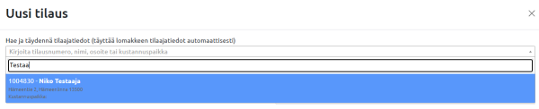 Käyttäjän näkökulmasta tämä tarkoittaa sitä, että yhden haun ja valinnan jälkeen suuri osa tilauksen perustiedoista on jo valmiina. Tarvittaessa tietoja voi vielä muokata ennen tallennusta.